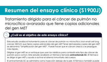 Este estudio analiza el tratamiento para el cáncer de pulmón no microcítico (non-small cell lung cancer, NSCLC) que tiene copias adicionales del gen MET Tener demasiadas copias del gen MET se denomina “amplificación del gen MET”. Puede hacer que el cáncer crezca y se propague más rápido. Dirigirse al gen MET es un enfoque que usan los médicos para combatir este tipo de cáncer de pulmón poco común. Este estudio analizará un fármaco llamado amivantamab SC. El fármaco se dirige al gen MET y ayuda a activar el sistema inmunitario del cuerpo. |