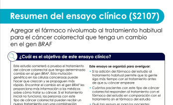 Título completo del ensayo: Ensayo de Fase II aleatorizado de encorafenib y cetuximab con o sin nivolumab (n.º de NSC 748726) para pacientes que tengan cáncer colorrectal metastásico BRAFV600E o no extirpable tratado anteriormente, con estabilidad de microsatélites